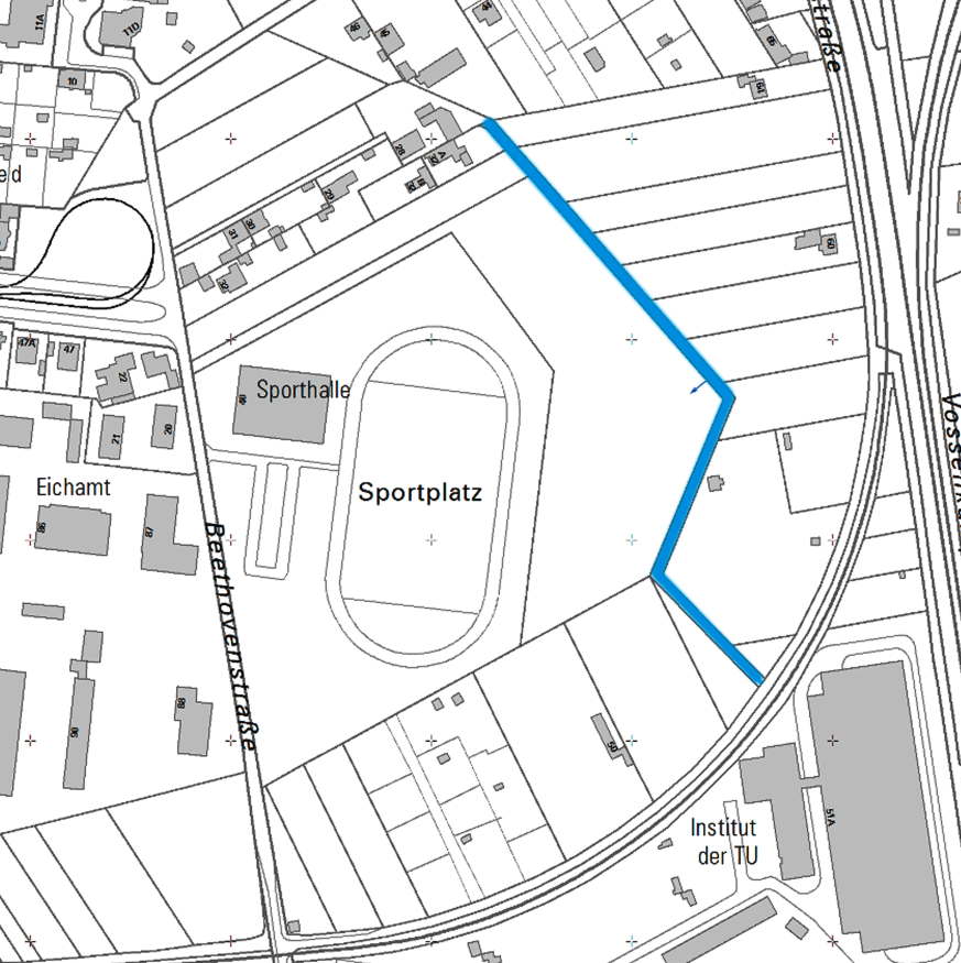 Beethovenstraße: von Rainer und Nellys Garten Richtung Sportplatz